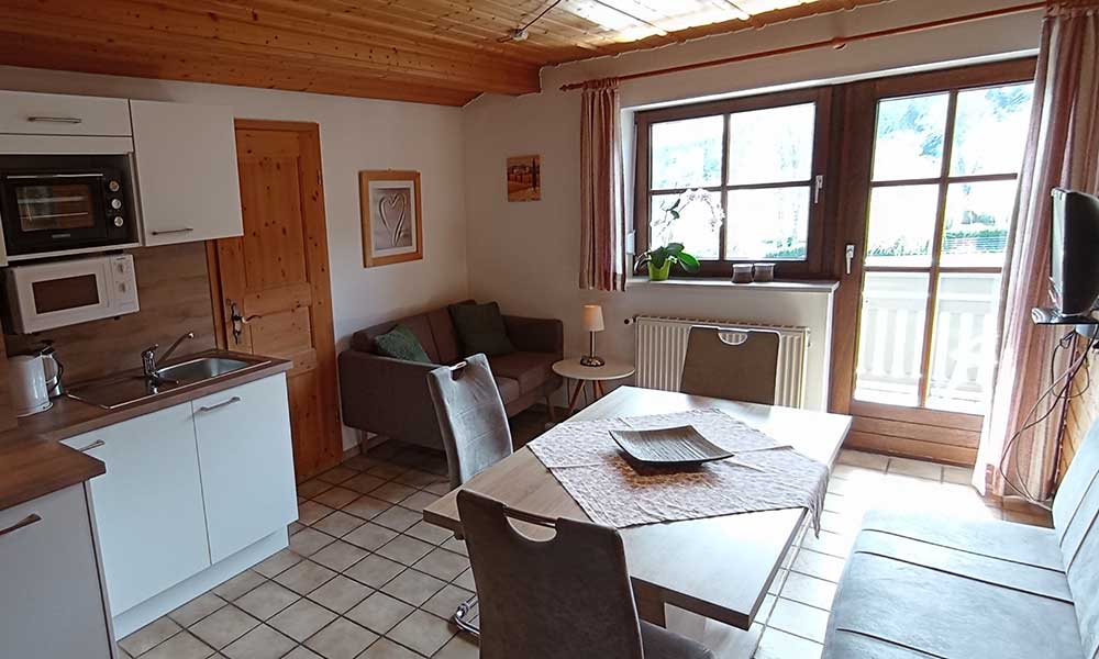 Wohnküche, 1 Schlafzimmer mit Zustellbett (möglich), Bad mit Dusche/ WC, Föhn, komplett ausgestattete Küche, Safe, SAT-Flach-TV, WLAN und Balkon (Süd)
